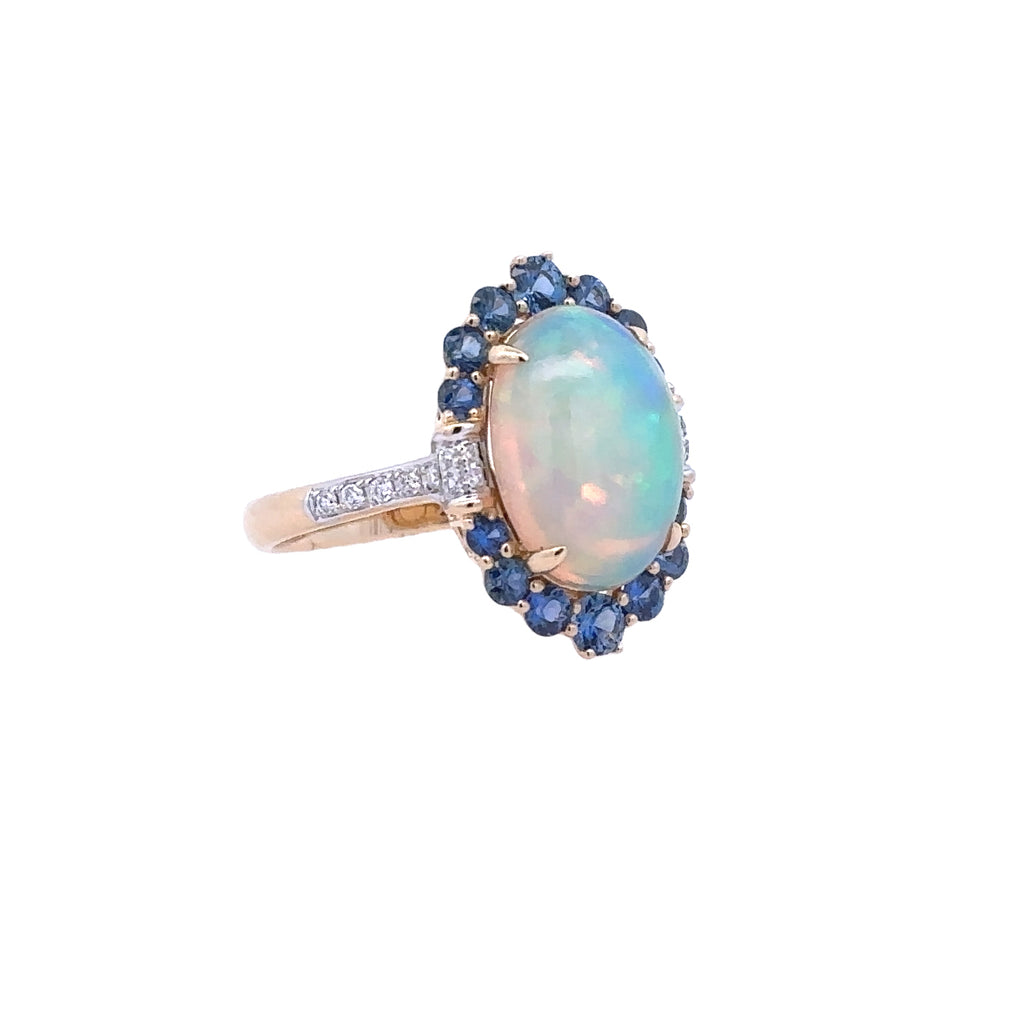 Lady's Yellow 14 Karat Oval Halo Fashion Ring Size 7 With One 3.09Ct Oval Opal, 0.90Tw Round Sapphires And 0.110000 Twt Other Stones